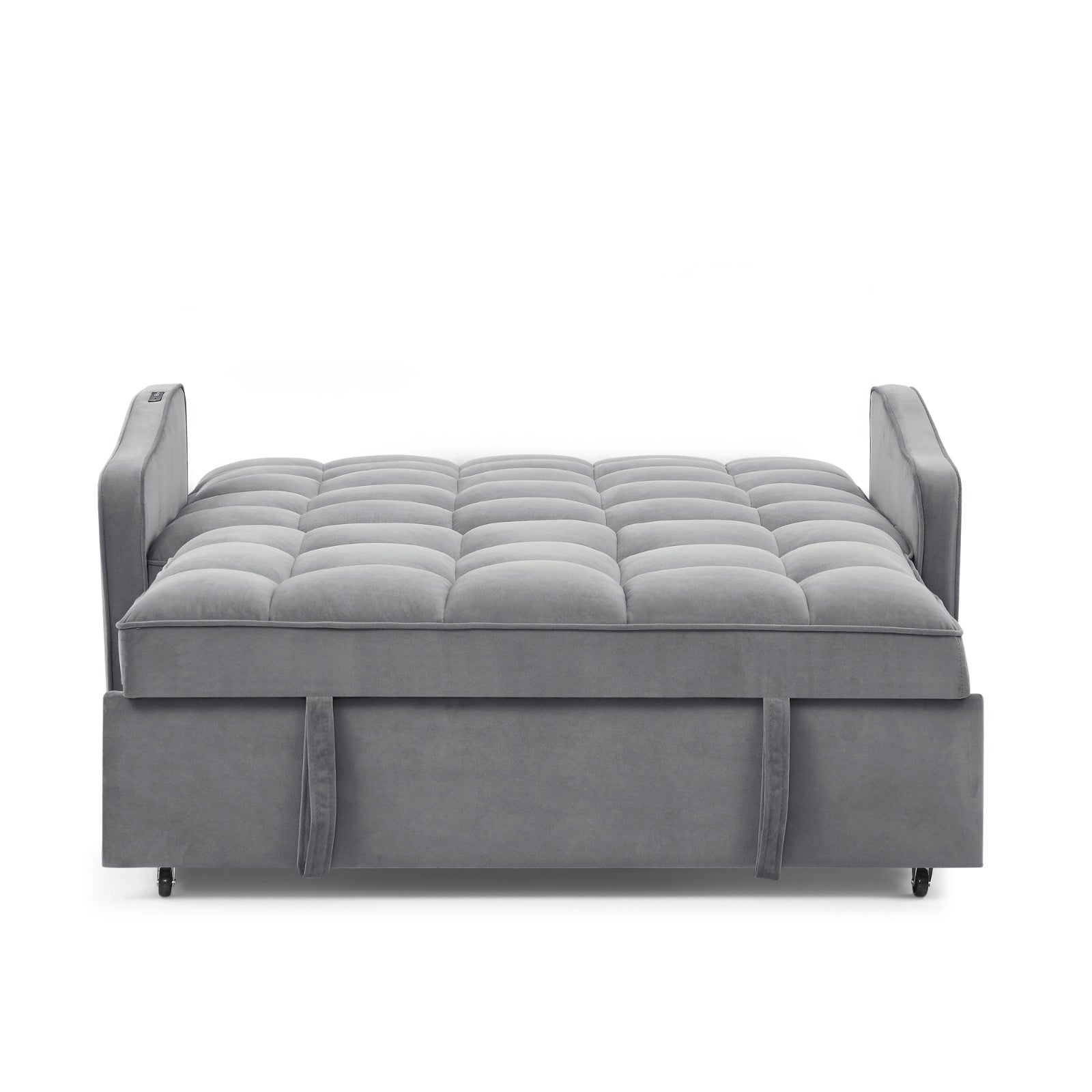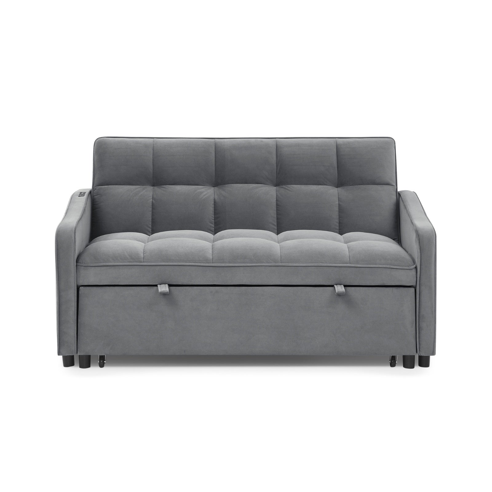 Upgrade your living space with the Loveseat Sofa Bed Pull-Out. Combining style, comfort, and convenience, this sofa bed features a pull-out bed, adjustable back, two built-in arm pockets, and Type-C & USB charging ports — perfect for modern homes. Crafted with luxurious grey velvet upholstery and a sturdy solid + manufactured wood frame, this loveseat offers both durability and elegance.